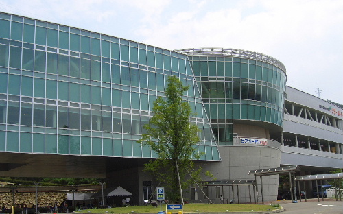 リラポートの建物は、山手にあります、ガラス張りの舟形をした