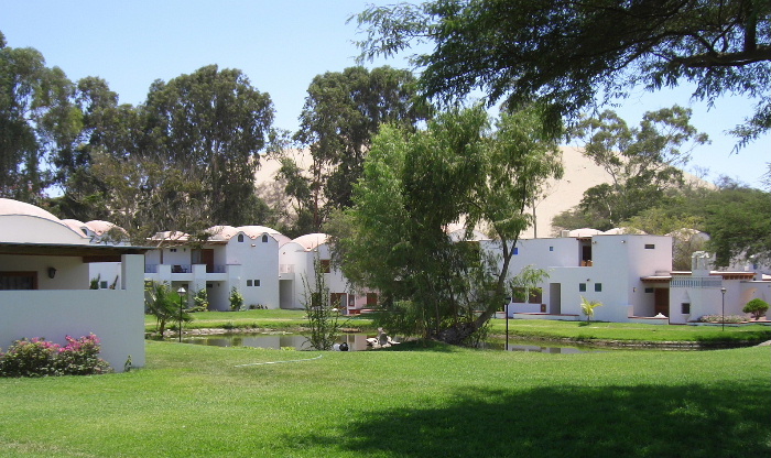 高級リゾートホテルがある。白い建物と緑の芝生がまばゆい!周囲は大砂丘