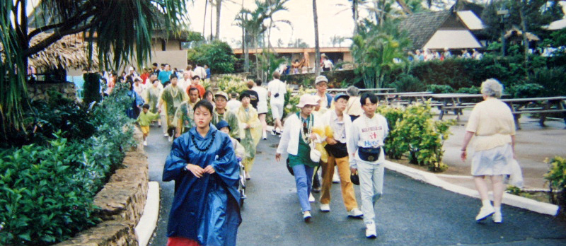 パーク内でガイドさんに連れられて これからショウを見に行きます