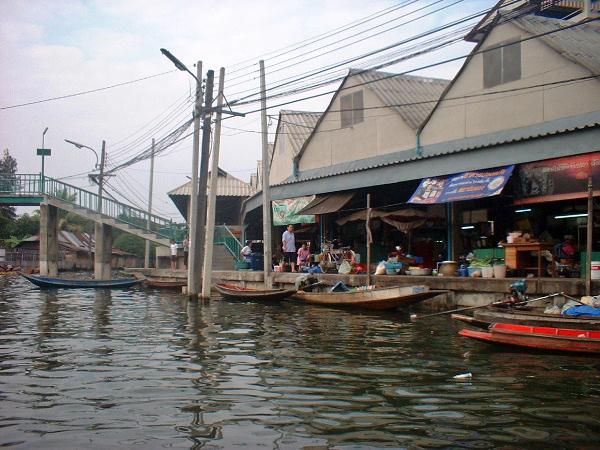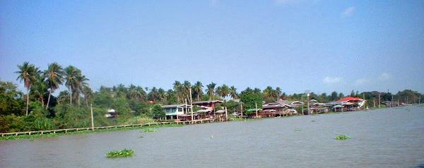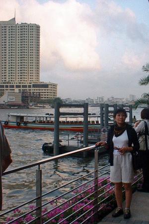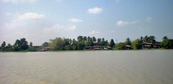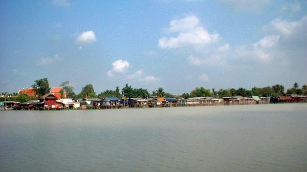 遊覧船でチャオプラヤー川岸に広がる、遺跡や村々を見るため、船着場で・・・
