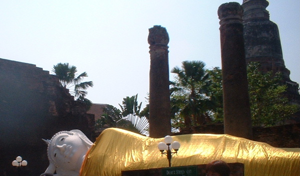 巨大な涅槃像、建物の屋根はなくなっているが、どでかい黄金色の袈裟を