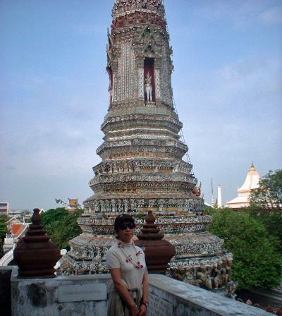 この仏塔の装飾は、中国の陶片とガラス粒がうめ込まれた細工で、高く!より高く!