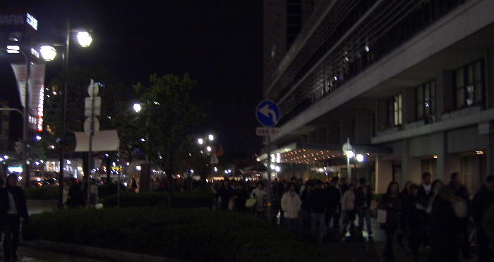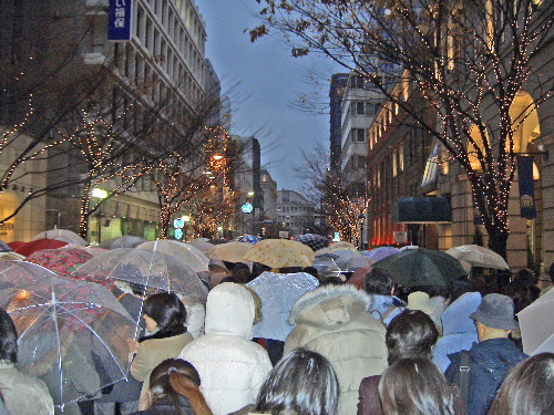 順番を並んで待とうと言う事で向った、ところが既に三宮まで列は繋 がっており、元町付近から三宮に迂回する行列に付いた、そこからが ドラマの始まり、雨脚が強まり大粒の霰が降ってくるは、寒風が吹くは お昼間の穏やかなお天気からは、想象できない台風の中にさられて いるようなもの、しかも、行列は進まない、雨の中ひたすら待つのみ |