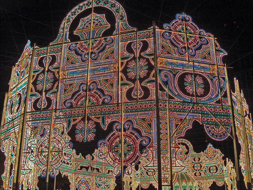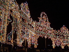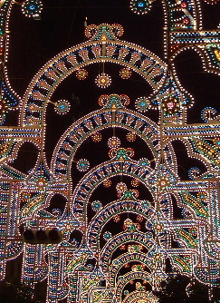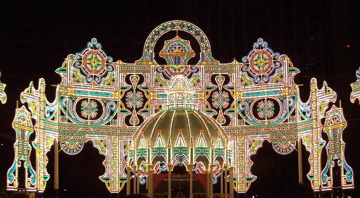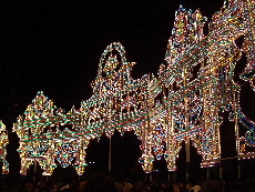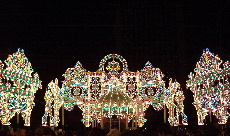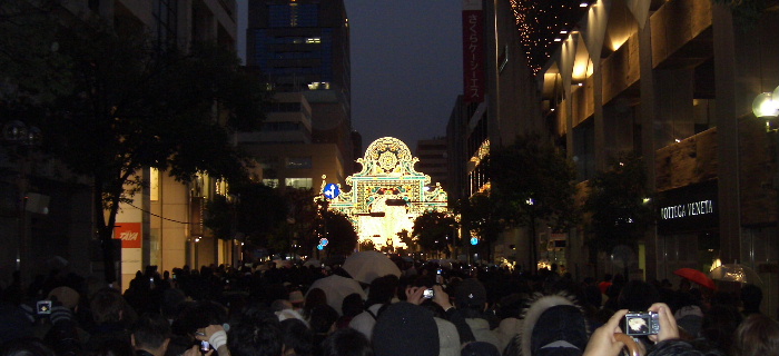 しかも5時前なのに、停滞していた行列が動き出した、どうなって るの?、角を曲がると、ルミナリエが目に飛び込んだ、主催者が 点灯時間を早めたのだ、それに合わせて、雨がピタッとやむとは |