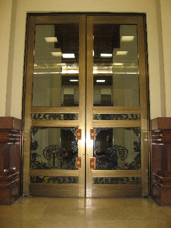 堅固な扉には獅子面があり、訪れる者の心を止める。フロアーのドアは