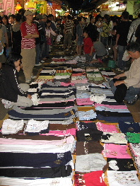 すごい人波、三角地帯の道路にお店が連なり、おまけに道路上にも、衣類