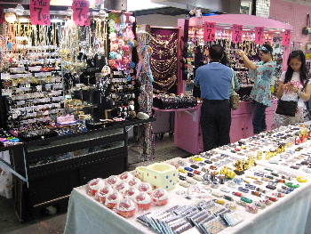 アクセサリー・食べ物等の露天がひしめく。道路上は禁止されているが、入り口