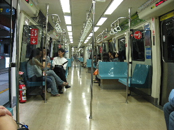 地下鉄のホーム、ごみ一つなく綺麗!電車の中、L型の椅子と中央の通路が