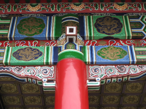 もので、朱色の柱が荘厳な雰囲気を醸し出し、緑と青との調和が素晴らしい