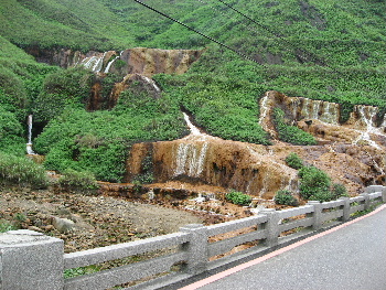 横たわっている。道路わきの川は、鉄分の多い水質のため、岩が茶褐色だ