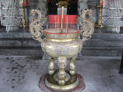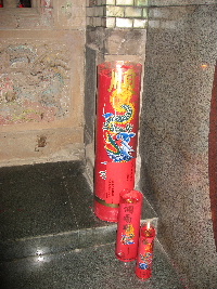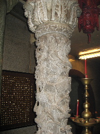 彫刻された柱は長い歳月を示す。ろうそくは赤く大・中・小と置いてある