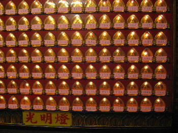 「光明灯」が並ぶ。入り口右の壁には、昔寄進した日本人の名札が並ぶ