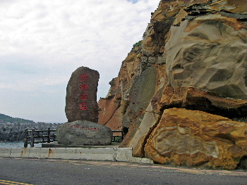 奇岩の傍には、「野柳社區」と赤字で刻まれた、大きな石碑が立っている