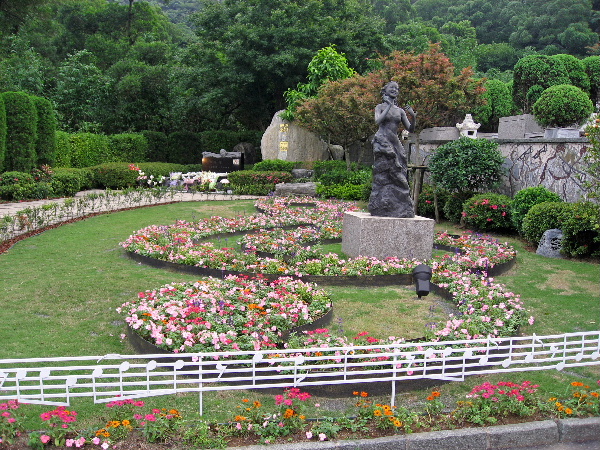 さらに奥には、芝生に囲まれ、音符の形にお花が植えられ、テレサの銅像が