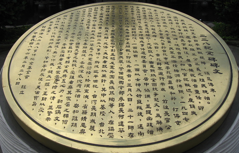 円形の銅版に記された「紀念碑文」。過去に心ない者が毀損したとか