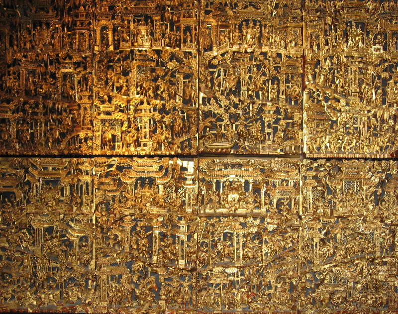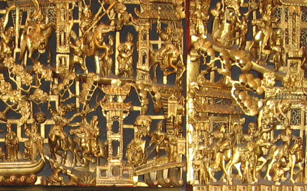 壁一面の、大きな透かし彫りの、歴史絵巻きのような大作が!