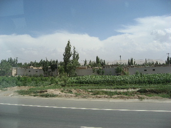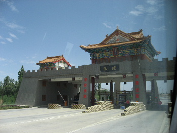 畑が続く。敦煌のゲートにさしかかった。建物も城門風だ。 .