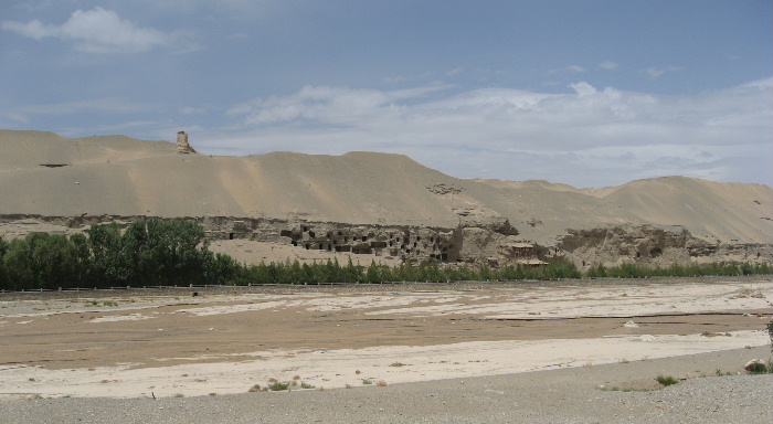鳴沙山の東の端辺りに位置する所、莫高窟が山すその断崖の所に
