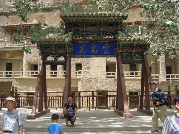 莫高窟と書かれたゲートがある。ゲートの向こうは鉄柵でガードされている