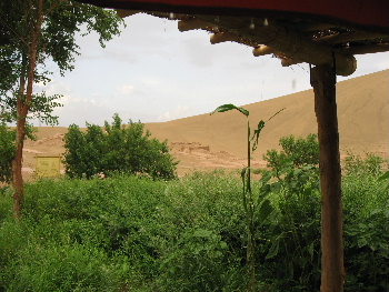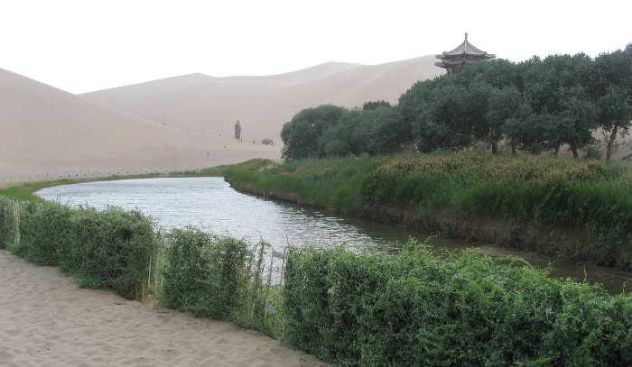 右側に三日月型の泉が「月牙泉」だ。1000年もの間枯れることなく湛えて来た