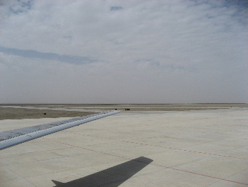 敦煌空港に着いた、飛行機の後方の景色は、だだっ広い砂漠だけ