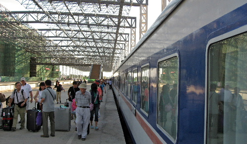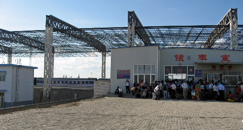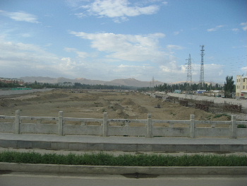 郊外の建設中の新駅から寝台列車でトルファンヘ。駅前の広場はレンガ