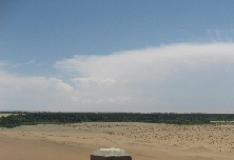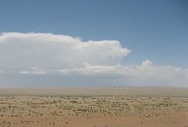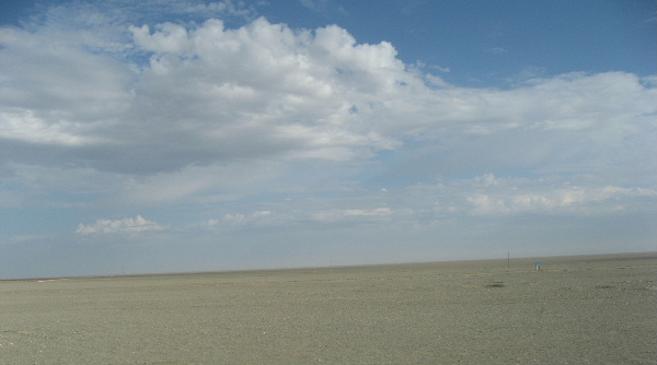 空の青と白い雲が気持ちがいい。地平線はここも砂!