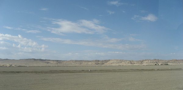 車窓からの眺めは、遠景に鳴沙山の山並みを見て、でこぼこの砂地が続く