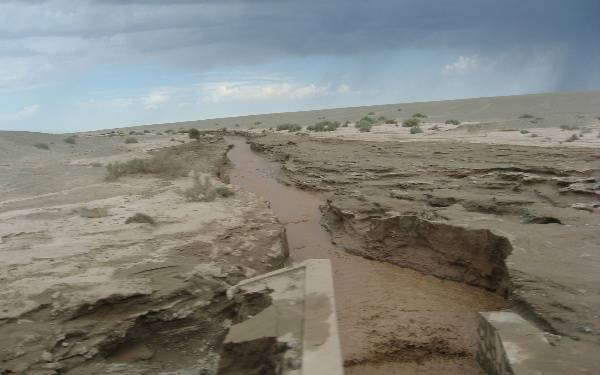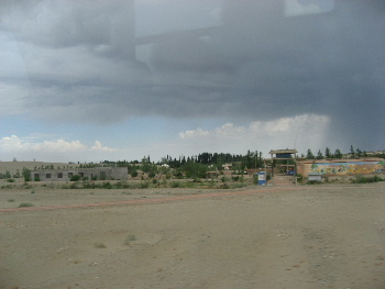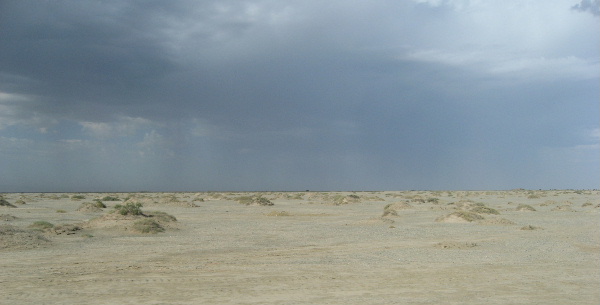 駱駝草が見えてき出した、オアシスは近い。遠方の空が曇っていて