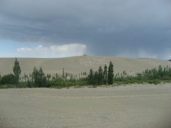 緑が見えてきた。砂山の頂上には孫悟空の巨大な人形が立っている、ここは