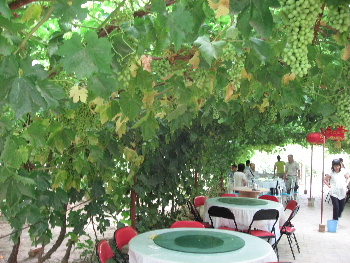 入り口は立派な門構えで、裕福さが分かる。葡萄棚の下には丸テーブルが