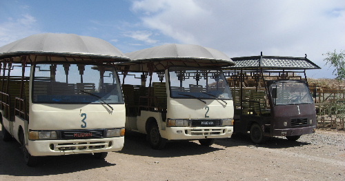 陽関の石碑堂と烽火台には、この屋根付き電気自動車で行く。15名ほど