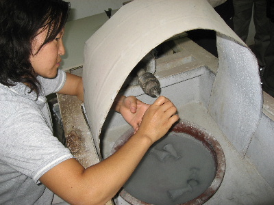 削り「杯」にした物で、緑色した物が高級品。荒削りから仕上げまで、数人の