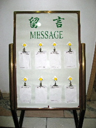 玄関を入った所に「留言」MASSAGEのボードが、メモ用紙がクリップで
