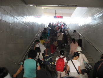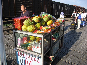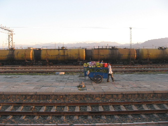 駅のホームには果物等の物売りが。それにしてもこのホームの床はセメント