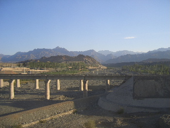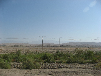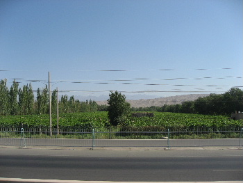 ブドウ畑が続く。郊外を外れると駱駝草の生える荒野に .