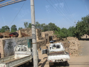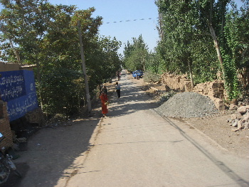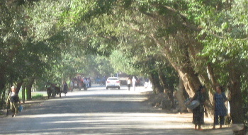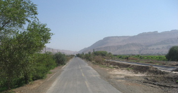 が残る、酷熱の地である。オアシスへの道に入ると、木々の緑が美しい。 .