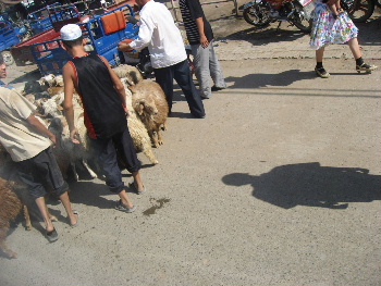 家畜も来ている、兵士の影が・・・。横丁には大きな風呂敷包みを・・・