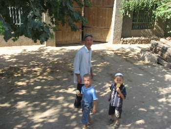 大きな家の前では、おじいさんと孫?アイスキャンデーを食べている