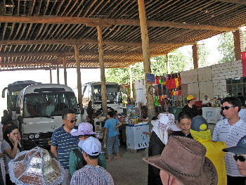 遺跡の前には、バスプール?両側にお店が並び、小さな子供が物売りを
