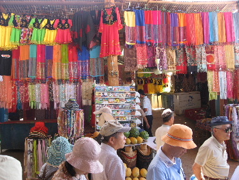 日常のお買い物は、パラソルのバザールで。三輪バイクが活躍している