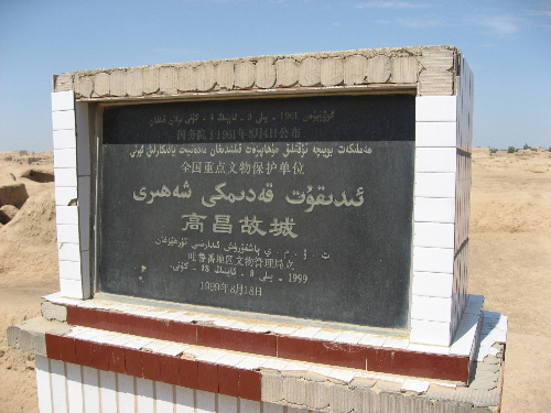 「高昌故城」の漢字と、アラビヤ文字の石碑。1999年8月18日「重文」に