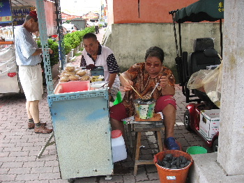 ここから道を隔てた近くに、武廟がある。歩道で「カルメラ」を製作販売