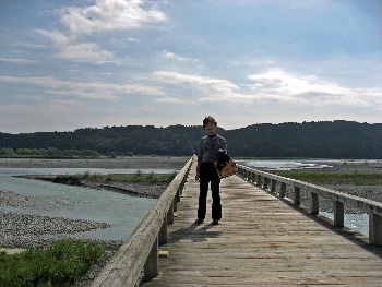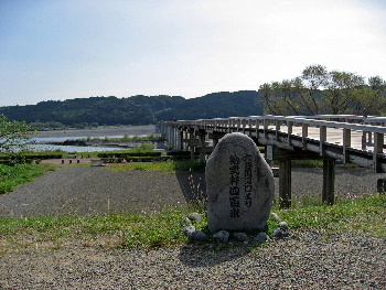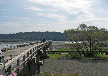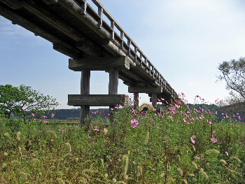 橋の真ん中ほどから、振り返ると一直線の橋は遠景のお山に繋がっているよう