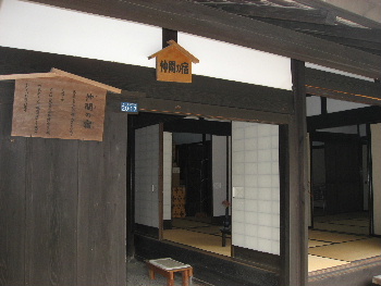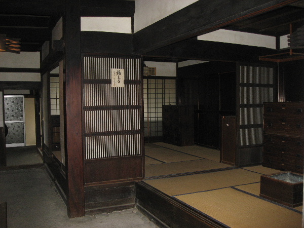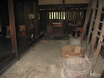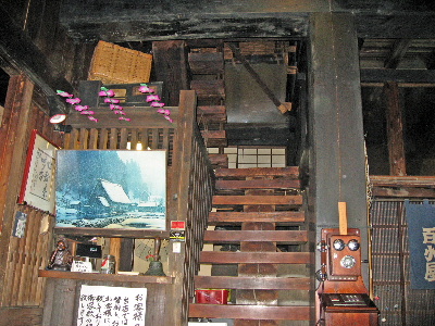 玄関を入ると、二階への階段が、実際は薄暗くしてある。土間を抜けると