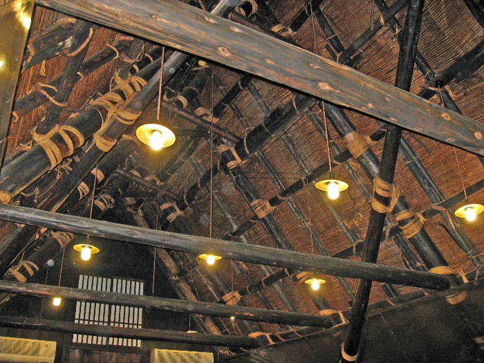 ここは、囲炉裏端もあるんですが、2階の座敷へ。茅葺屋根の屋根裏が