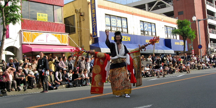 帯祭りを代表する「大奴」の列があり、続いての集団は「猿太彦」や「お神輿」の