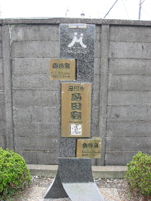「夢舞台東海道」マーク石柱に、「島田宿」の文字が、大奴のイラスト入り