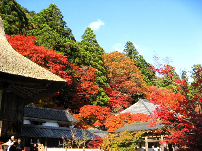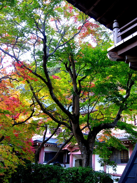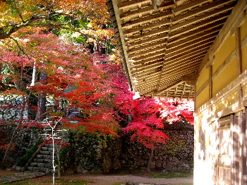 本堂の裏手には、屋根を覆うように、紅葉が展開してます