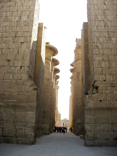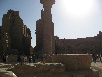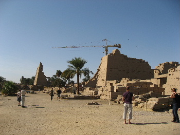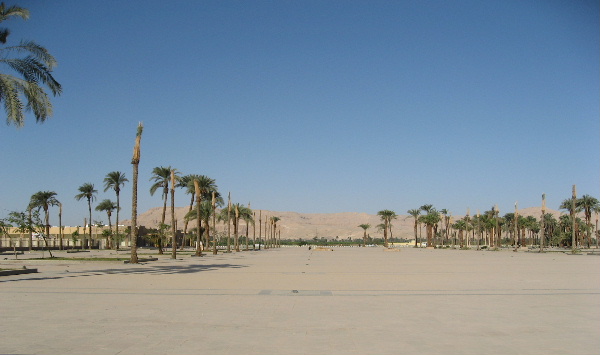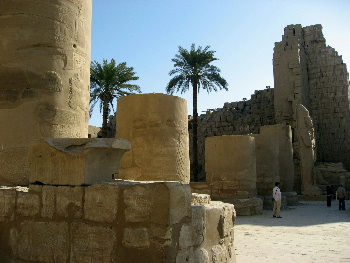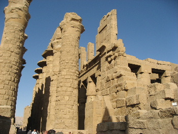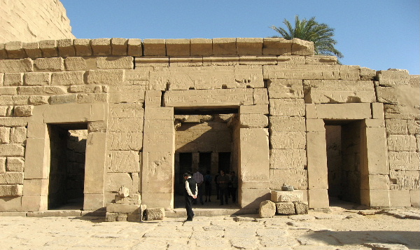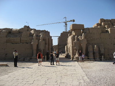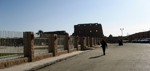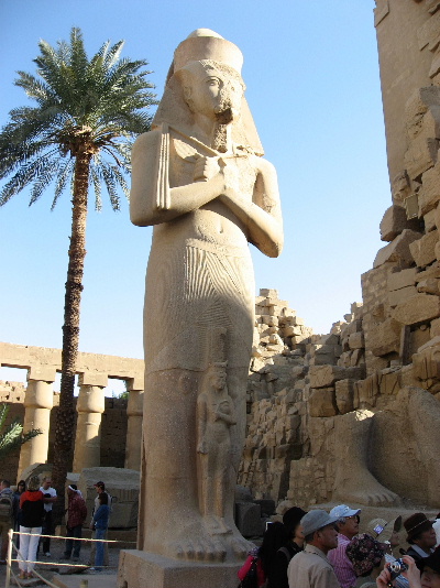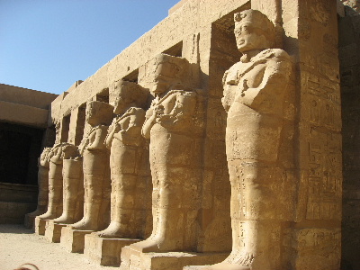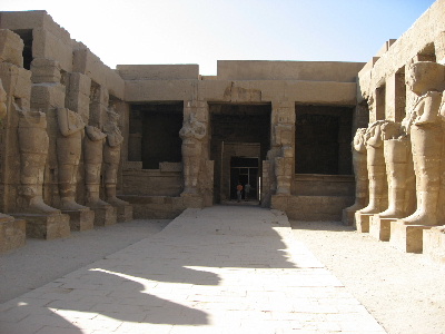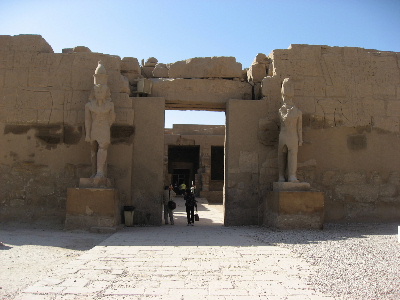 ラムセス3世の神殿。入り口の両側に王の像が、ここでも 左足を1歩前にして